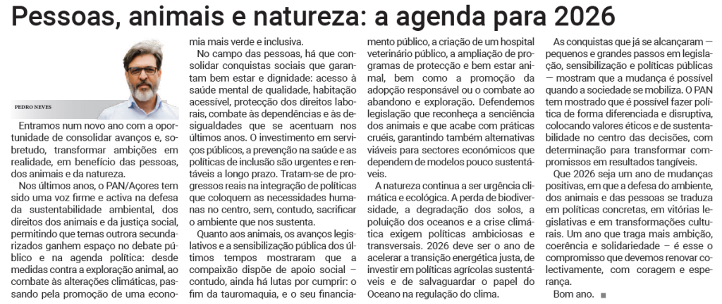 Que 2026 seja um ano de mudanças positivas, em que a defesa do ambiente, dos animais e das pessoas se traduza em políticas concretas, em vitórias legislativas e em transformações culturais. Um ano que traga mais ambição, coerência e solidariedade – é esse o compromisso que devemos renovar colectivamente, com coragem e esperança.