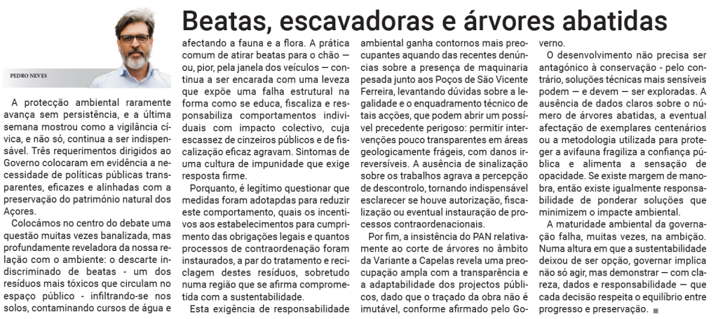 A protecção ambiental raramente avança sem persistência, e a última semana mostrou como a vigilância cívica, e não só, continua a ser indispensável. Três requerimentos dirigidos ao Governo colocaram em evidência a necessidade de políticas públicas transparentes, eficazes e alinhadas com a preservação do património natural dos Açores.