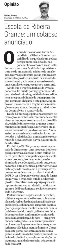O episódio ocorrido na Escola Secundária da Ribeira Grande, materializado na queda de um pedaço de viga numa sala de aula, não pode ser lido como um acaso isolado, nem como uma fatalidade imprevisível – trata-se de um exemplo evidente de uma lógica reactiva, que mistura gestão pública com administração de crises, fruto de anos de desinvestimento, adiamentos sucessivos e de uma complacência que se tornou estrutural.